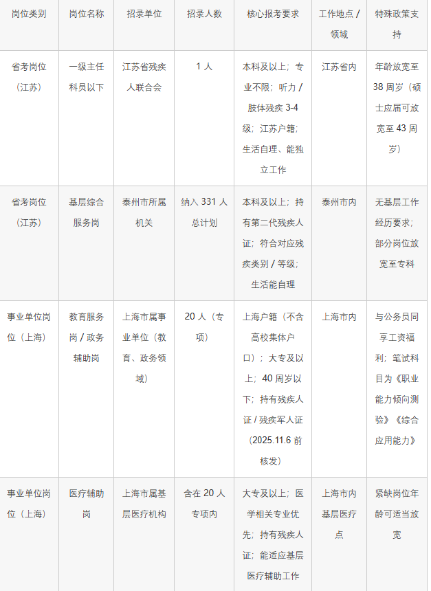 2026年公务员及事业单位招录中,残疾人岗位迎来扩围,放宽双重利好,国考中央层级岗位、省考地方定向岗位及事业单位专项招聘形成互补,覆盖教育、政务、残联等多个领域。以下为大家梳理的核心岗位详情,报考须知与备考建议等。