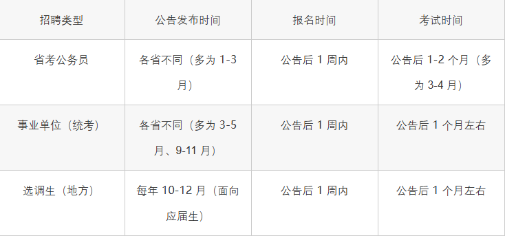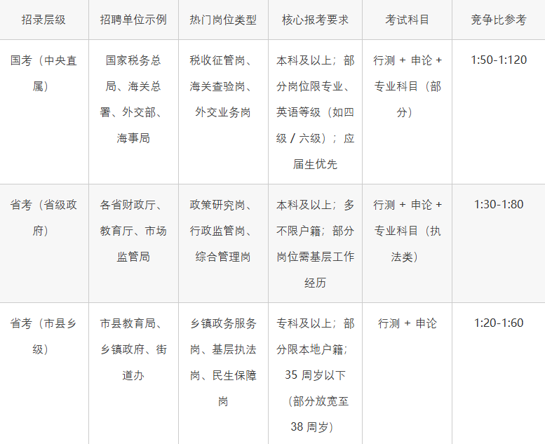 学历门槛:公务员国考、选调生多要求本科及以上,省考乡镇岗、事业单位工勤岗可放宽至专科,专业技术岗需对应专业学历