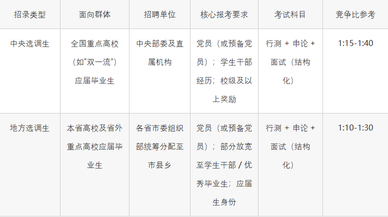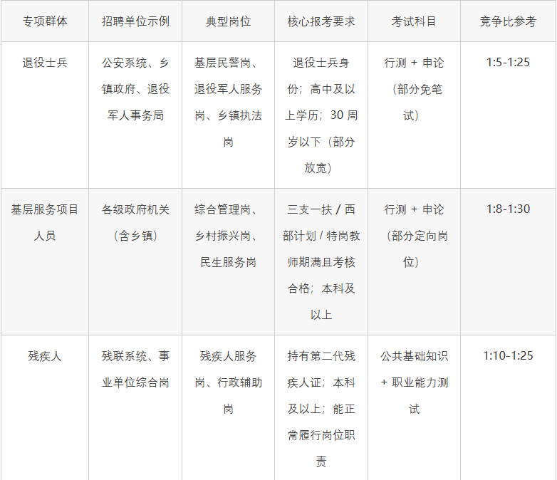 身份要求:应届生在国考、选调生、事业单位中优势明显,社会人员需满足基层工作经历,专项群体需提供对应证明