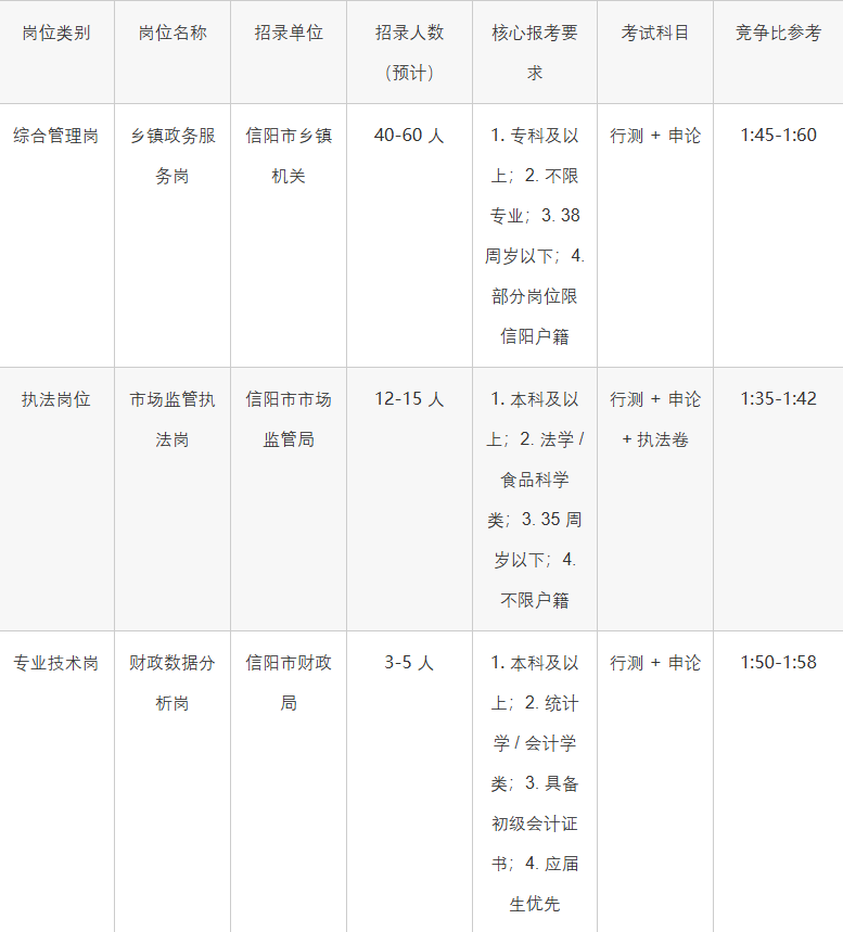 立即搜索2026年信阳市考公考编进入筹备阶段,公务员省考预计释放千余岗位,事业单位招录覆盖气象、教育、医疗等重点领域,其中气象部门已率先发布专项招聘公告。两类招录均呈现年龄放宽、户籍限制减少的利好趋势,为应届生及社会人员提供多元入编路径。以下为核心招录信息与备考方案。