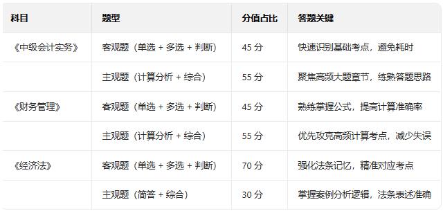 中级会计考试共设3个科目,需在连续 2个考试年度内通过全部科目才能拿证,各科考核重点差异明显,备考需针对性规划。