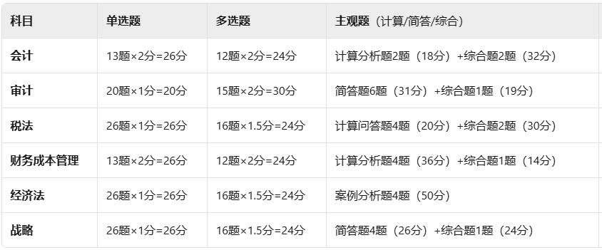 全部为综合案例分析题(试卷一:会计+审计+税法;试卷二:财管+战略+经济法),每卷50分,总分60分及格。